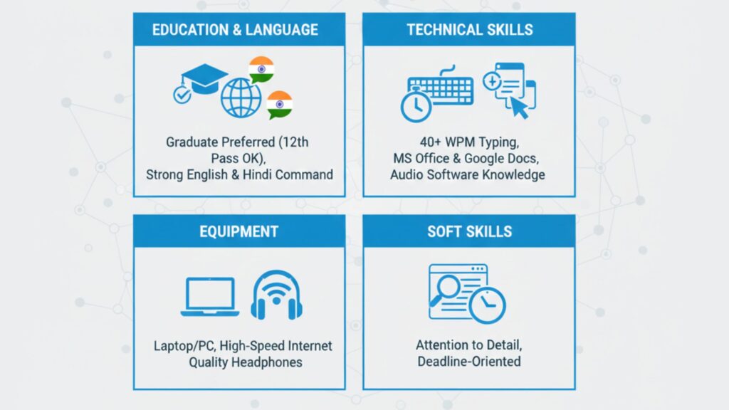 | Primary Skills | Listening, Typing, Grammar, Proofreading |